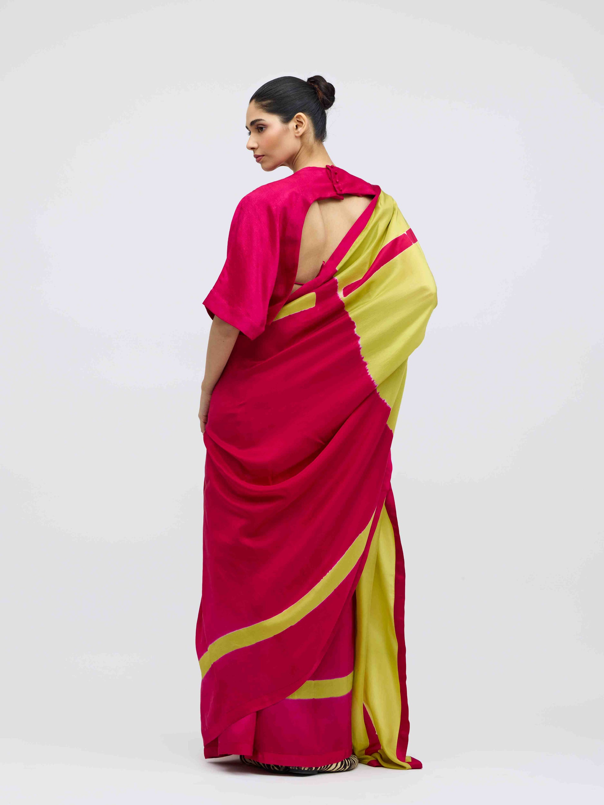 Rani pink body with chartreuse pallu. The pallu acts as the inverse of the body through resist dyeing.